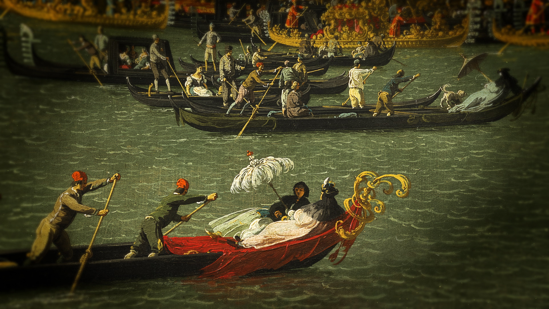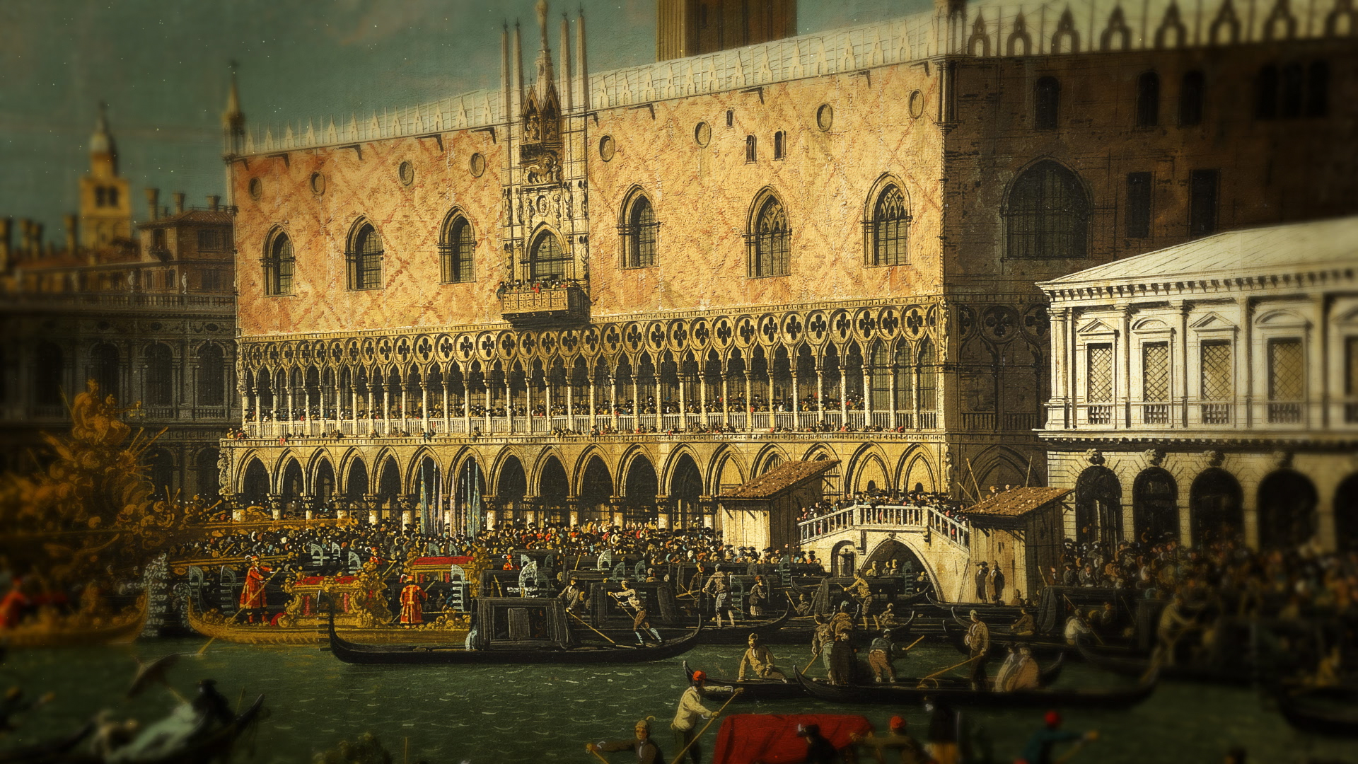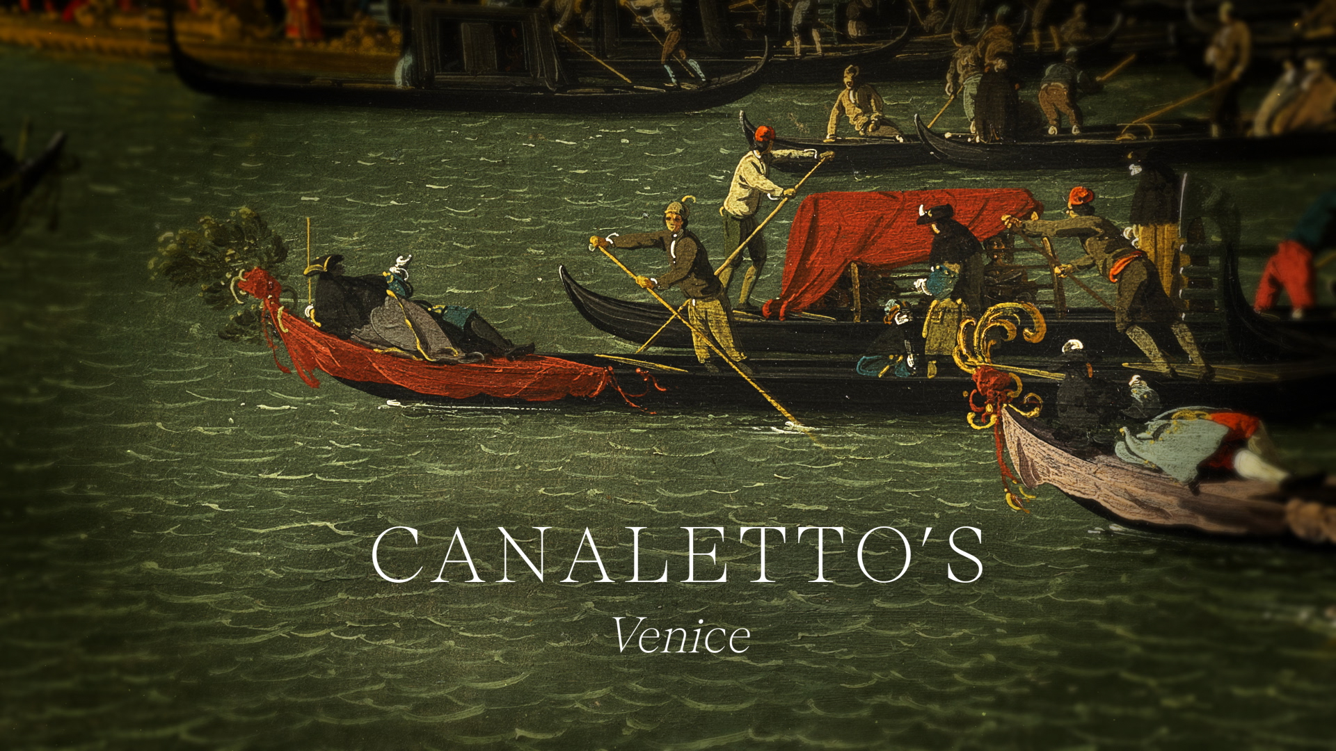 We reconstructed the painting in three-dimensional space, allowing light to fall across its surface and reveal the depth, texture and precision of Canaletto’s brushwork. Through digital rostrum moves, parallax layering, extrusion and displacement, we guided the viewer through the scene — from the ceremonial spectacle of Venice’s Ascension Day to the finer details that define the artist’s mastery. Ink bleed footage and painterly textures were interwoven with subtle visual effects, creating a seamless narrative that balanced historical context with contemporary energy. Sound design and music was also mixed by us to create the pace, segues and atmosphere for the sequence, featuring Handel’s Water Music.